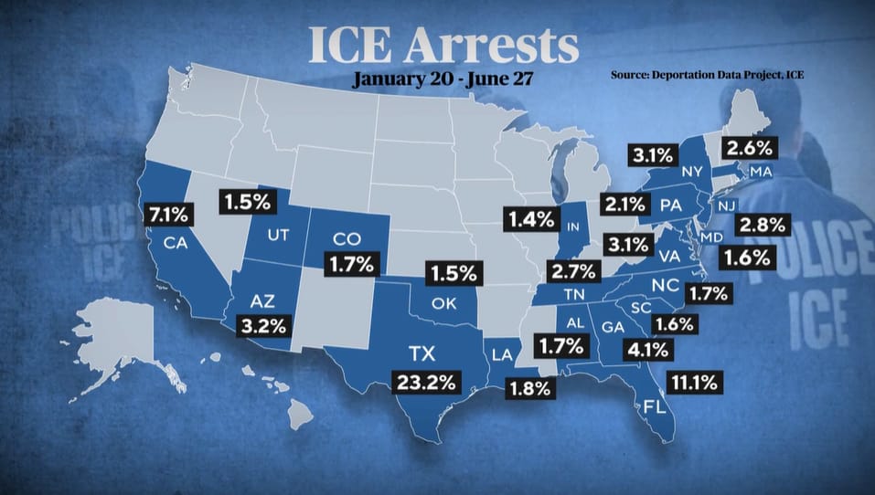 And if you’re wondering where California stands in all this: the state ranks third in total arrests during the first six months of President Trump’s term, with most ICE raids and detentions concentrated in Southern border states. Nationally, 42% of those arrested had no criminal history.