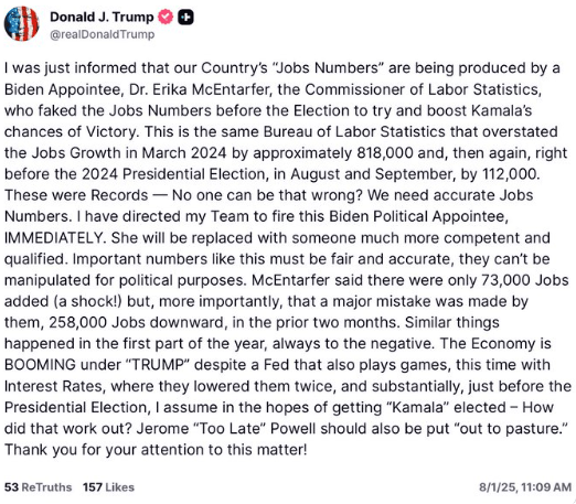 Firing the Messenger? Trump Ousts BLS Chief After Bleak Jobs Report